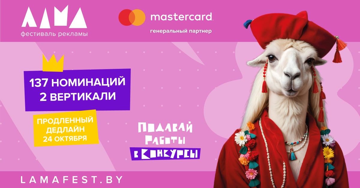 Фестиваль рекламы ЛАМА продлевает финальный дедлайн приема конкурсных проектов до 24 октября! У представителей индустрии коммуникаций, маркетинга и рекламы Беларуси есть еще немного времени, чтобы заявить о своих идеях широкой профессиональной аудитории, привлечь внимание брендов и партнеров, а также попасть в Рейтинги креативности.